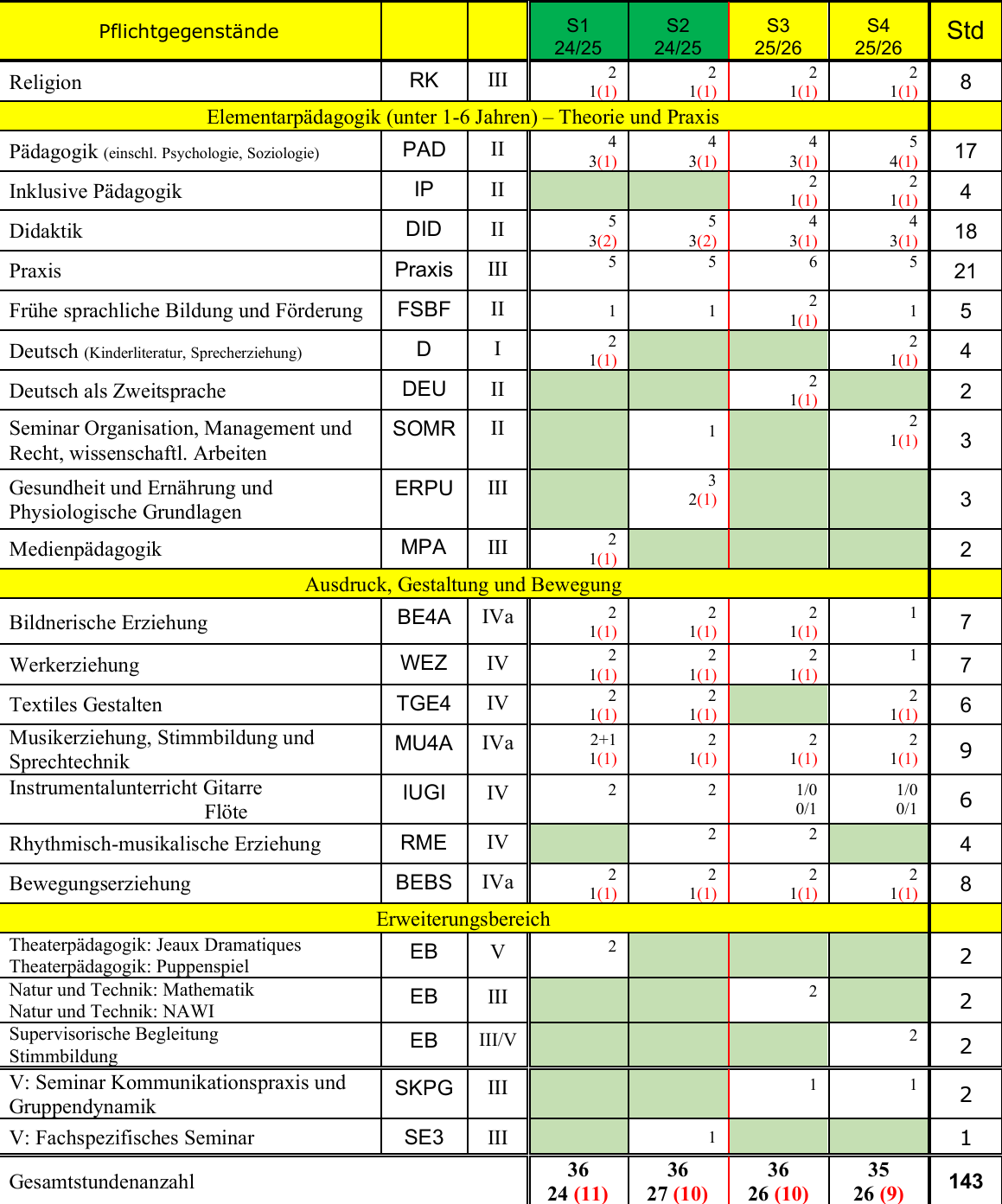 Praxis: ein Praxistag pro Woche (vormittags) und 8 Blockpraxiswochen,
