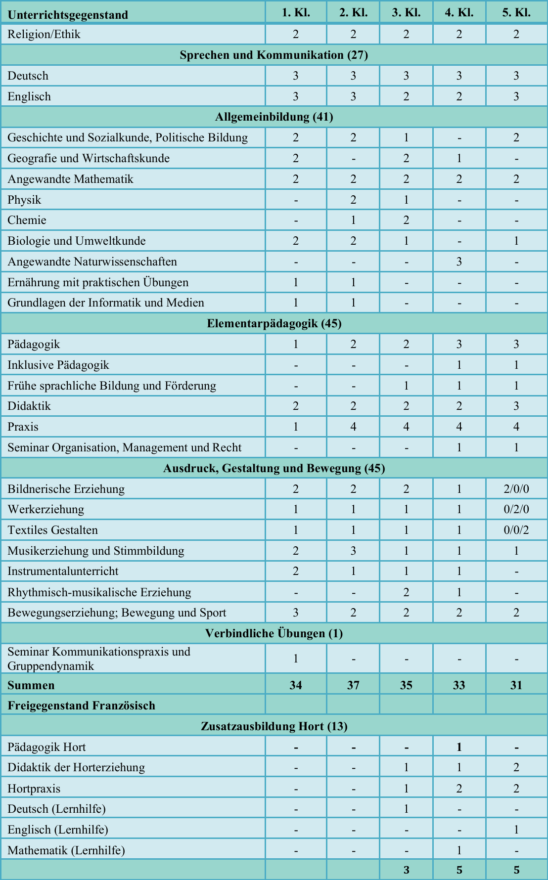 Stundentafel (BHS inkl. Hort)
